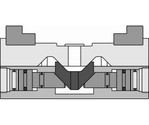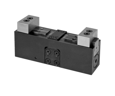 The hydraulic vise with a concentric clamping function consists of a very slim basic body with 2 integrated hydraulic cylinders. The piston forces are transferred via a guided connecting link to the two clamping slides so that a centric synchronism is obtained.