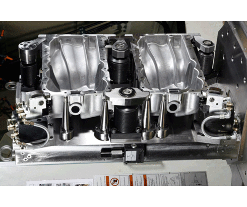 In a double clamping fixture four oil sumps for cars.