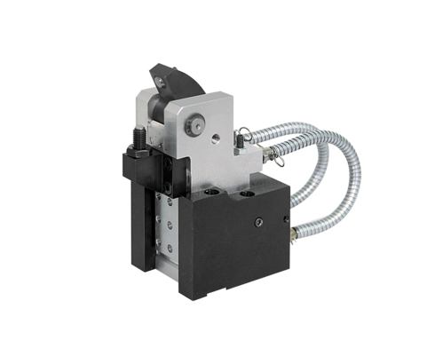 The position flexible clamping claw consists of an U-shaped mounting body and the displacably embedded clamping unit with oil supply by two short high-pressure hoses with swarf protection.