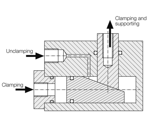 クランプ力に対する反力(例:加工力)は、楔形ピストンのかすかな弾性で支えられます。反力は最大クランプ力を超えてはなりません。