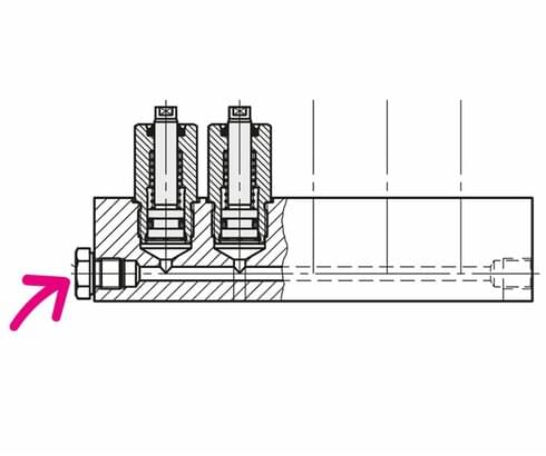 Therefore bleeding has to be effected during start up. As it is not possible to bled the threaded-body cylinders individually, screw plugs should be provided in the fixture body at the end of the drilled channels for bleeding.