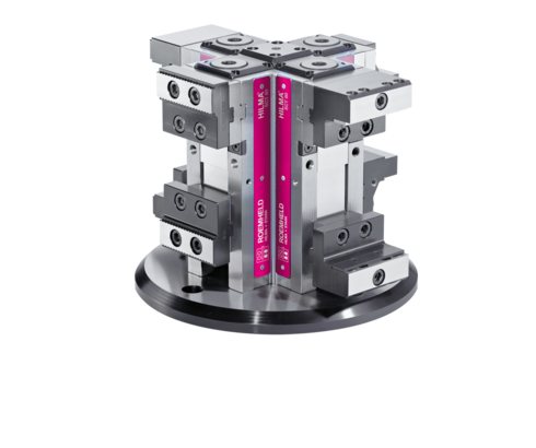 Tower workholding systems of the HILMA.SCT series excel by a very compact design. Thanks to the adjusting spindle arranged in the upper part of the housing, deformation in the base during clamping is reduced.