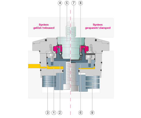 - The spring pre-tensioning force is initiated via the piston (6), the piston moves down and grips the retractable nipple. The fit is joined and the retractable nipple (7) is positioned with high precision.