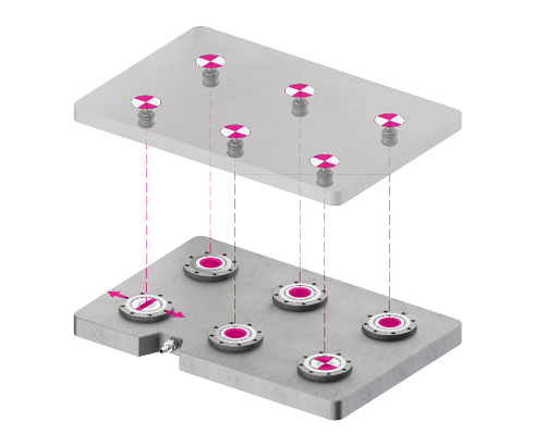 Due to the large equalisation, it is sufficient to prepare the position of the elements and retractable nipples with generous tolerances. The entire system is always zero point accurate.
