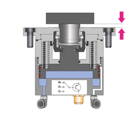 • If there is no retractable nipple in the insertion mechanism, the piston (2) moves to the stop position – "clamped without retractable nipple" signal.