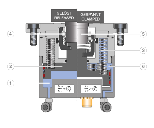 A piston is held in the clamping position by springs. The piston has a double-acting pneumatic design.